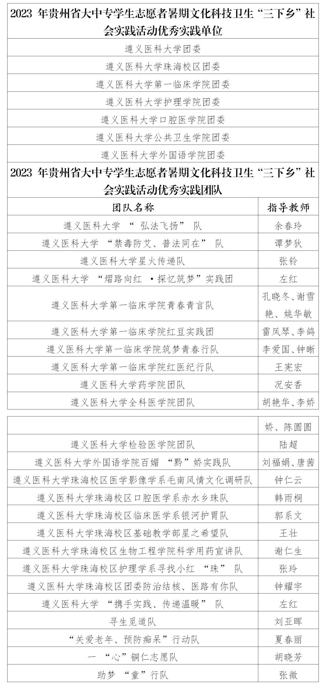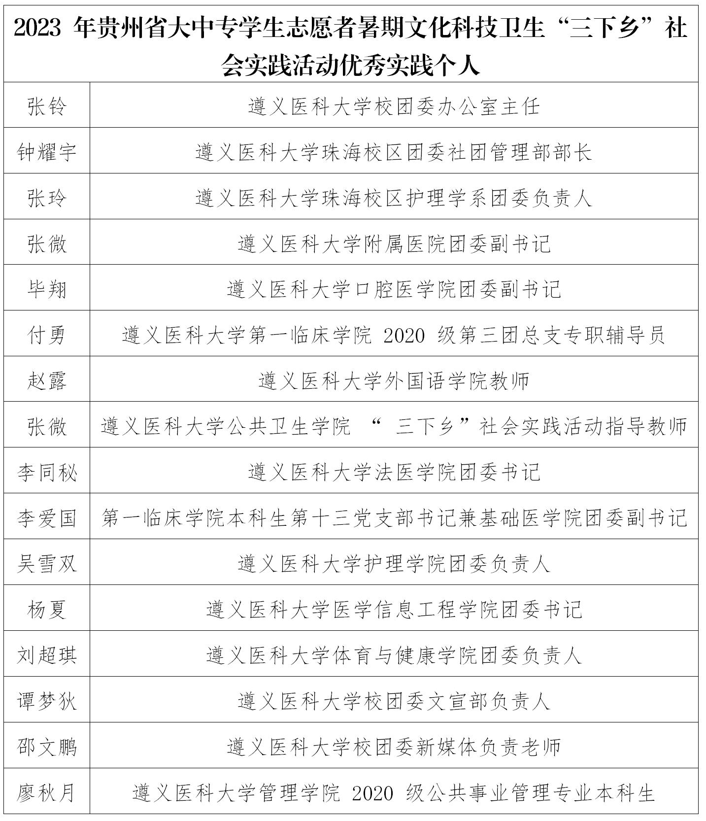 近期,共青团中央、团省委陆续公布2023年大学生暑期“三下乡”社会实践活动评选结果。遵义医科大学团委再次荣获全国“三下乡”社会实践优秀单位,校团委办公室张铃被评为全国“三下乡”社会实践优秀个人;7个单位、24支团队、16名个人、1个品牌项目荣获省级优秀荣誉。